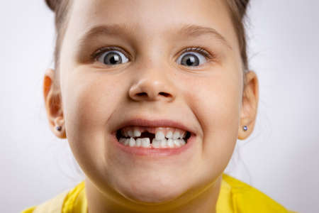 Close-up of super excited female kid with opened mouth showing missing front baby tooth and bulging eyes on white background. First teeth changing. Going to dentist to do tooth treatment