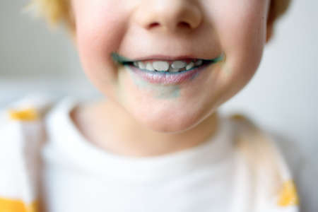 Closeup of a toddler boy showing to the camera his missing milk teeth.