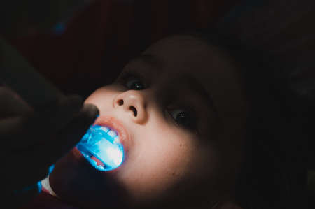 Ultraviolet in dentistry, the dentist holds a device with ultraviolet light to quickly seal the filling in the child's tooth, light only from ultraviolet light.