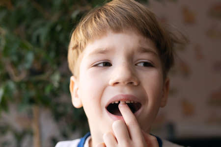 Portrait of scared blond boy showing wobbly baby tooth in his mouth on blurry background of apartment. Tooth aches or new tooth grows.