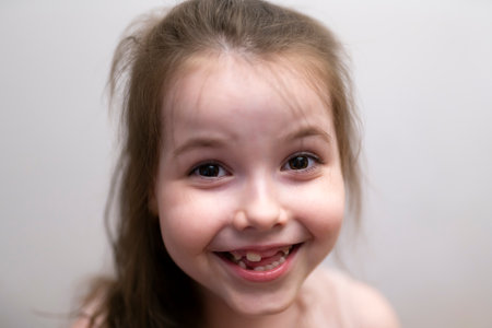 Adorable girl with open toothless mouth with temporary milk crowding teeth in white studio. Dental work with cross bite