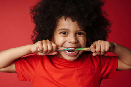 Changing milk teeth. An over-set of teeth, the boy’s milk teeth have not yet fallen out, but indigenous