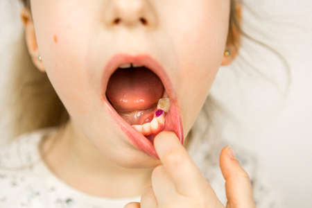 Child opening mouth and trying to remove wobbly baby tooth with tongue. Macro of dental cavity during changing milk teeth to molar teeth. Concept of oral health care.