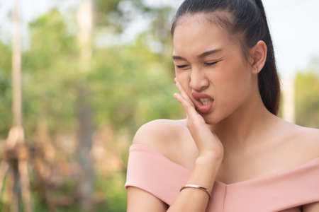 Beautiful Asian woman in the mood for a toothache A small lightning flash appeared on her cheek, like a tingling sensation in her teeth