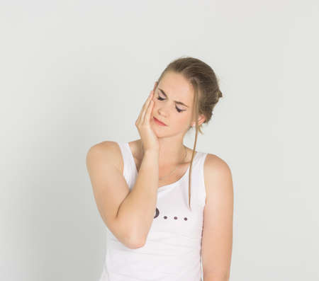 An unhappy upset young girl with a painful look, grimace, suffering from toothache or a feeling of stress, facing problems.