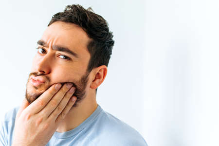 portrait of suffering unhappy troubled handsome bearded man touching his cheek he has toothache. handsome young man scratching his beard. Close up