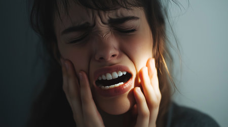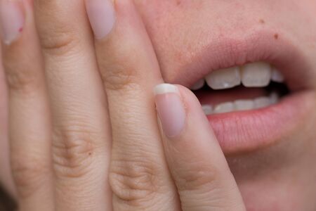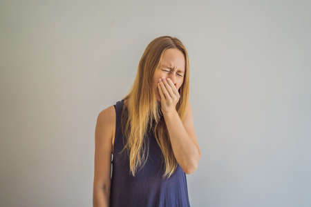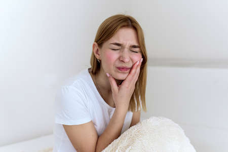 Woman touching her cheek because of tooth pain. Woman suffering from toothache, dental illness or oral diseases. Closeup of woman face with painful expression. Teeth problem. Female feeling tooth pain