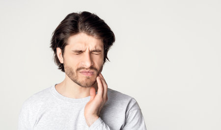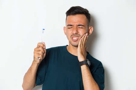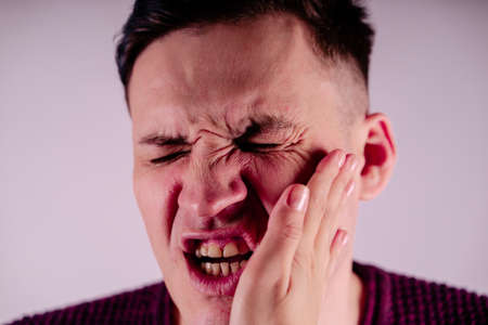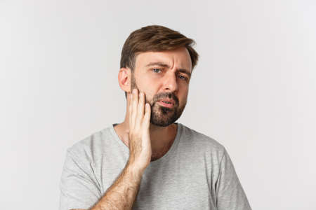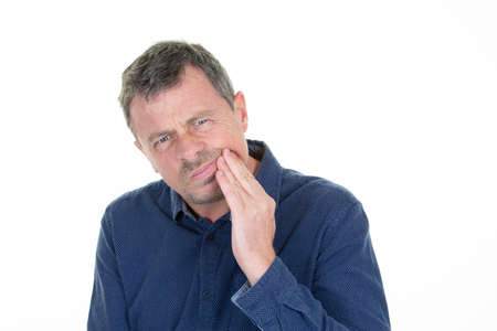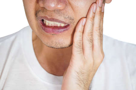 man with toothache; portrait of man suffering from toothache pain, tooth decay, tooth sensitivity; oral health care, dental care concept on white background