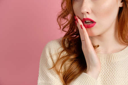 A close shot of the face of a red-haired girl with red manicure and lipstick holding her hand against parted lips, focus on the lips. Horizontal photo