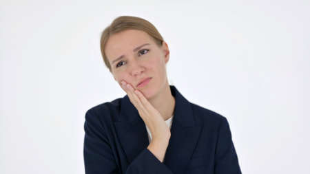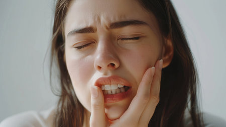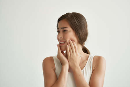 Close up of woman has a toothache, touches her teeth and frowns from painful discomfort, stands over white background.