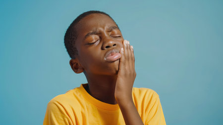 Upset handsome African American boy with closed eyes touching cheek, having toothache wearing stylish yellow casual t shirt isolated on blue background. Dental treatment concept