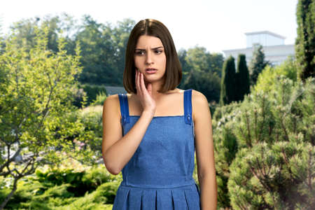 Woman feeling tooth pain outdoor. Unhappy girl with terrible toothache on summer nature background.