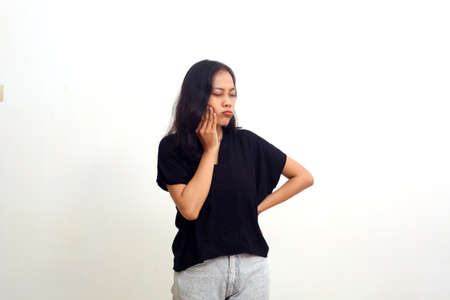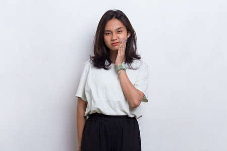 asian beautiful young woman suffering from toothache pain, tooth decay, tooth sensitivity; oral health care, dental care concept on white background