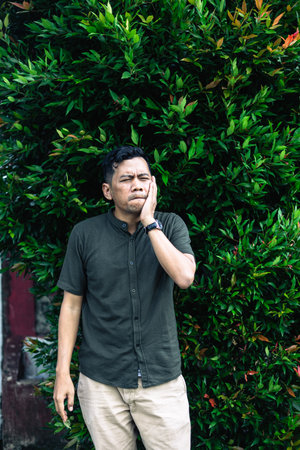 A man experiencing a toothache while standing in front of a wall of green foliage.
