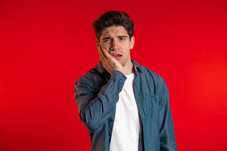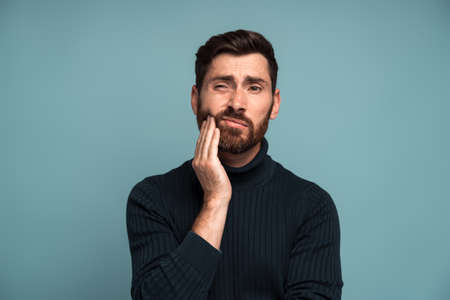 Dental problems. Portrait of unhealthy man pressing sore cheek, suffering acute toothache, periodontal disease, cavities or jaw pain. Indoor studio shot isolated on blue background