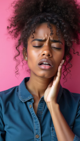 A young Black woman with curly hair is holding her face in pain against a vibrant pink background. Her expression conveys distress, highlighting the emotional weight of her discomfort and the stark contrast of her skin tone against the lively backdrop.