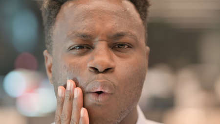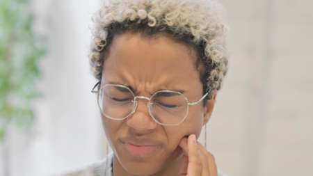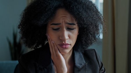 African girl businesswoman student woman with curly hairstyle suffer from toothache sick female touch cheek feel teeth pain has sensitive bleeding gums caries dental health problem with hygiene