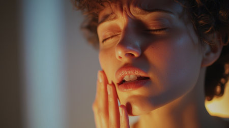 A young woman displays deep emotion, gently touching her face and reflecting in a cozy, softly lit indoor space during the evening hours. The warm light enhances the mood.