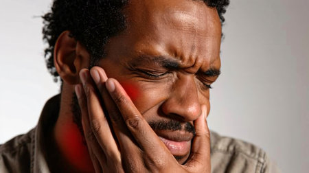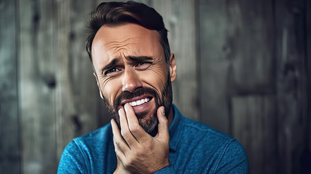 Man with sensitive teeth touching his cheek. Beautiful style illustration. Generative AI art