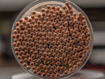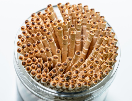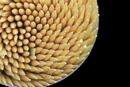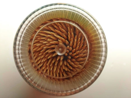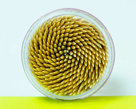 Glass jar with toothpicks, top view, macro shooting, spiraled lines, wooden composition, macro images, sharp sticks.
