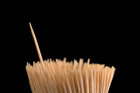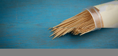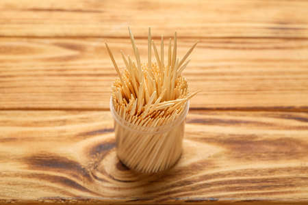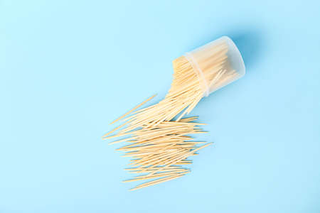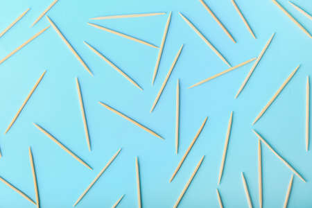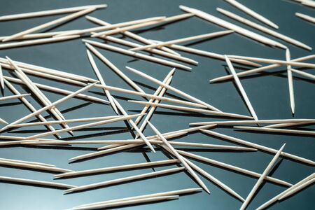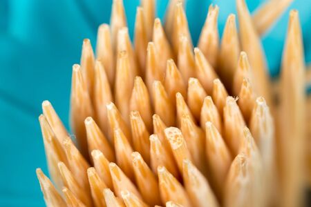 Wooden toothpicks on a blue background. A sharp object for brushing teeth