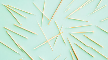 An artistic arrangement of assorted toothpicks scattered on a soft green background, showcasing unique textures and patterns for various creative uses.