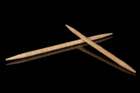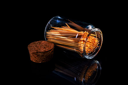 bamboo wooden toothpicks in glass jar, wine glass. in bucket. toothpicks on black background. front view toothpicks, dropped from hand, place for text, close up