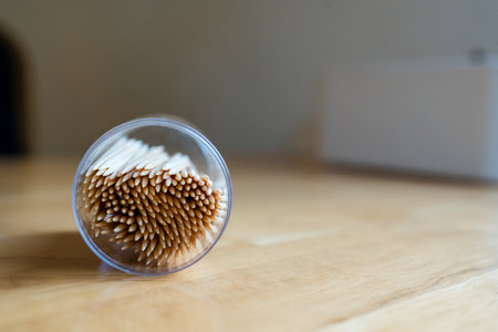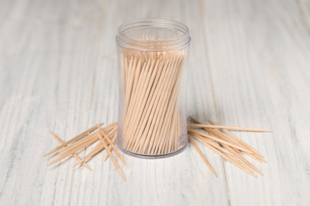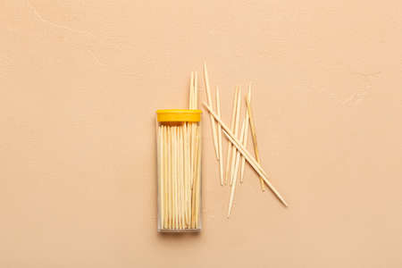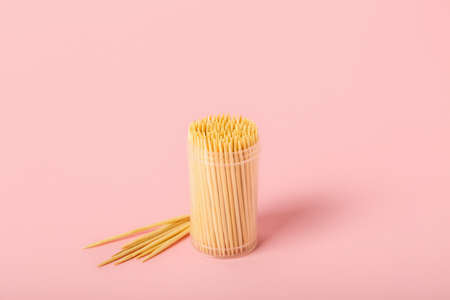 Plastic jar with wooden bamboo toothpicks lies on a yellow background. Oral hygiene after eating.