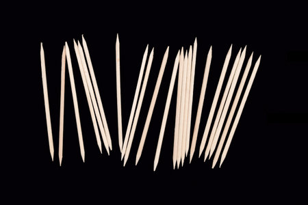 A bunch of wooden toothpicks are lined up on a black background. The toothpicks are all the same length and are arranged in a neat row