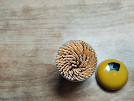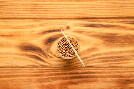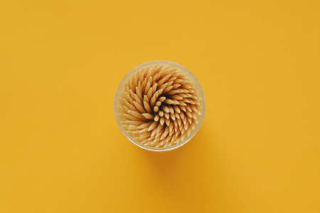 Round plastic jar with bamboo toothpicks on a yellow background. view from above. Oral hygiene after eating.