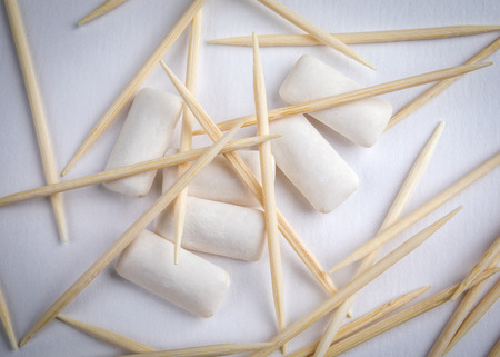 Toothpicks and chewing gum on white background. Dental hygiene and health