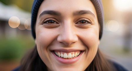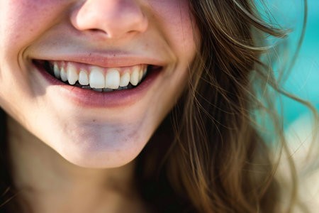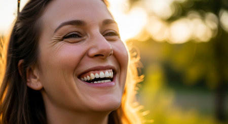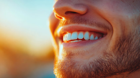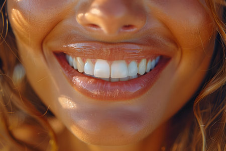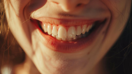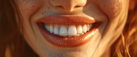 Close-up of a smiling woman's mouth with visible healthy teeth basked in warm sunlight