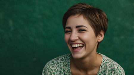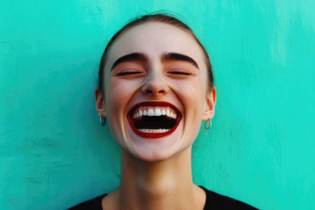 Young Woman Laughing Joyfully Against Vibrant Teal Background.