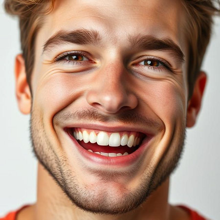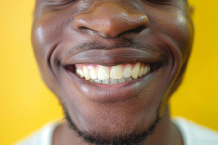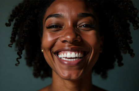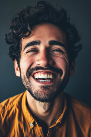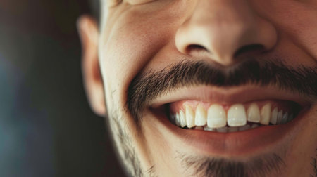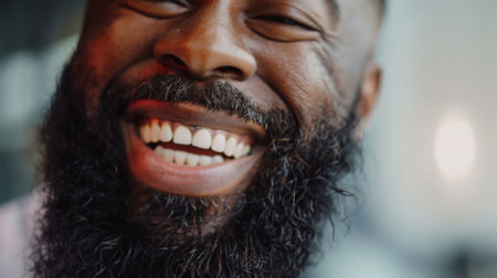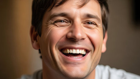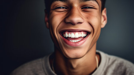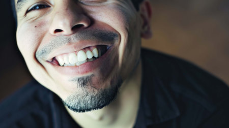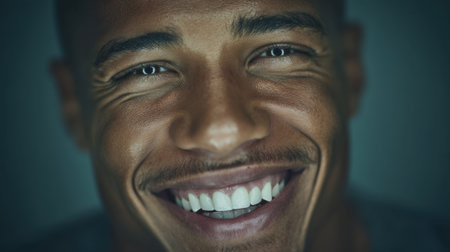 Close up portrait of smiling man with warm expression, showcasing bright white teeth and confident demeanor. lighting highlights his facial features, creating inviting atmosphere