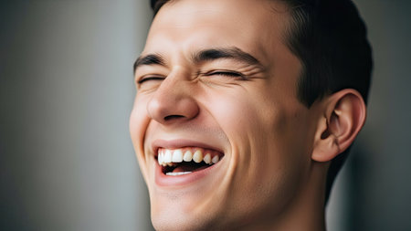 A close-up portrait shows a person laughing with eyes closed. The image emphasizes the face with focus on expression and teeth. The composition utilizes soft lighting creating a natural atmosphere. This image is suitable for various commercial uses related to emotion or human interaction.