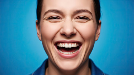The image features a close-up of a person with a wide, genuine smile. The skin tones appear warm, and the background is a solid blue. The lighting highlights the facial features. This image could be used for various projects including advertising, editorial content, and articles related to happiness and well-being.