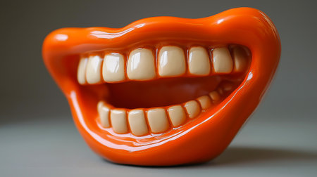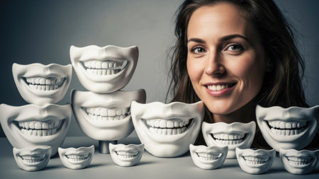 A woman smiles alongside numerous white sculptures of mouths and teeth. The image showcases a studio setting with soft lighting and a neutral background. This visual composition could be employed in dental health promotions or for conceptual designs emphasizing happiness and positivity. It also suggests uses for creative editorial content.