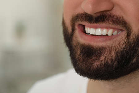 Man's shining smile close-up, white healthy teeth. Dentistry and charm. High quality photo