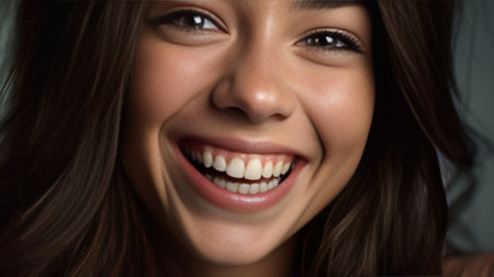 Close up portrait of young happy smiling woman with healthy teeth and beautiful smile