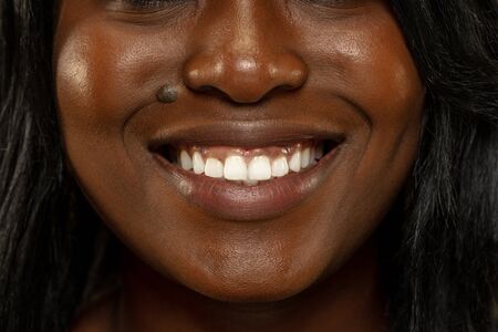 Young african-american woman isolated on yellow studio background, facial expression. Beautiful female close up portrait. Concept of human emotions, facial expression. Smiling.