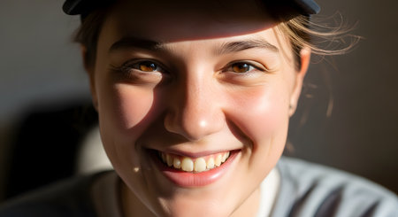 A bright and sunny close-up portrait of a young woman with a genuine and infectious smile. Wearing a baseball cap, her face is illuminated by a warm stripe of sunlight, highlighting her joyful expression and natural beauty.
