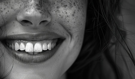 An AI generated illustration of a beautiful woman's smile in grayscale