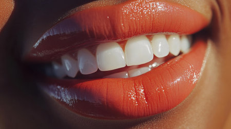 A woman showcases a cheerful smile with glossy orange lips and white teeth, illuminated by warm sunlight, highlighting the beauty of natural expressions.