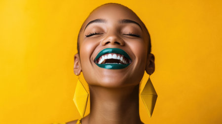A vibrant close-up of a young woman smiling broadly, showcasing bold green lipstick and striking yellow earrings. The cheerful expression radiates positivity against a bright yellow backdrop.