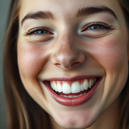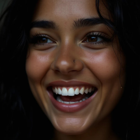 A close up view of a womans face with a big smile, showing her teeth and dimples. Her eyes are sparkling with happiness, and her cheeks are slightly flushed. The womans hair frames her face softly, enhancing her joyful expression.
