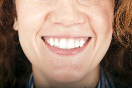 Smile teeth. Laughing woman mouth with great teeth close up. Healthy white teeth. Closeup of smile with white healthy teeth.