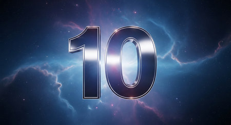 Vibrant neon number ten on a dark background with swirling patterns and bright lights