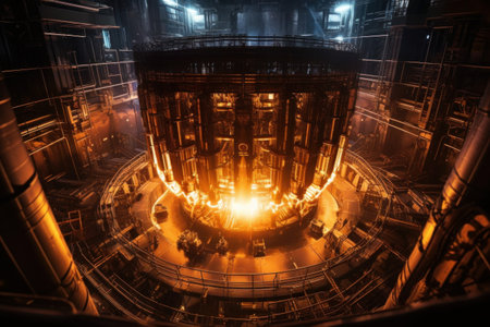 A massive glowing nuclear fusion reactor, with pipes snapping across a vast metal structure, glowing with intense heat and energy. Technicians in hazmat suits monitor the reactor. Generative AI