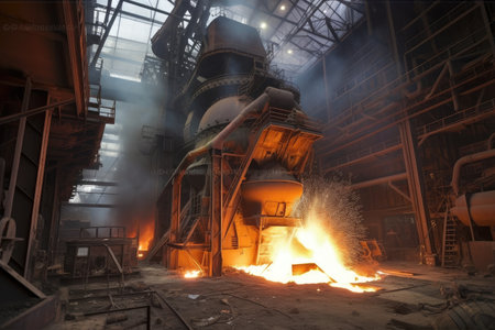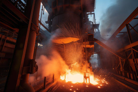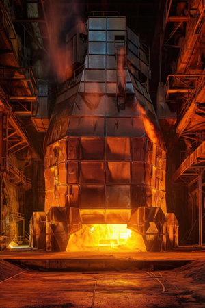 huge blast furnace with flames and sparks flying, preparing to melt ore, created with generative ai