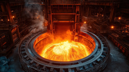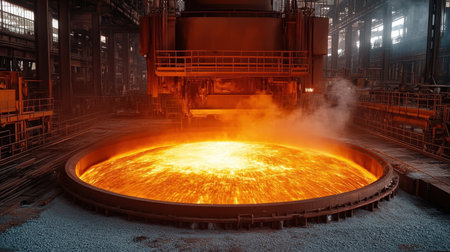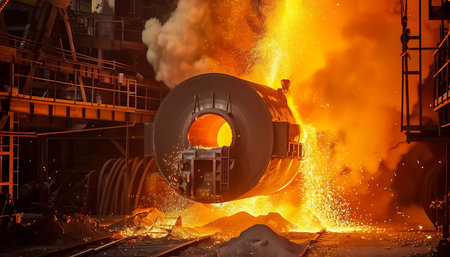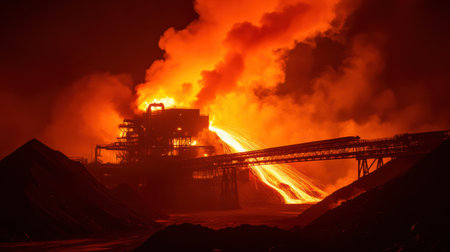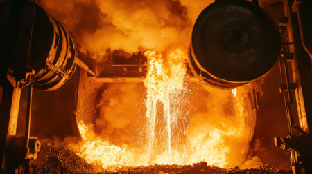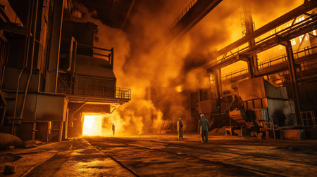 An industrial furnace emits fiery flames and molten steel, creating a dramatic atmosphere in a manufacturing facility at night.